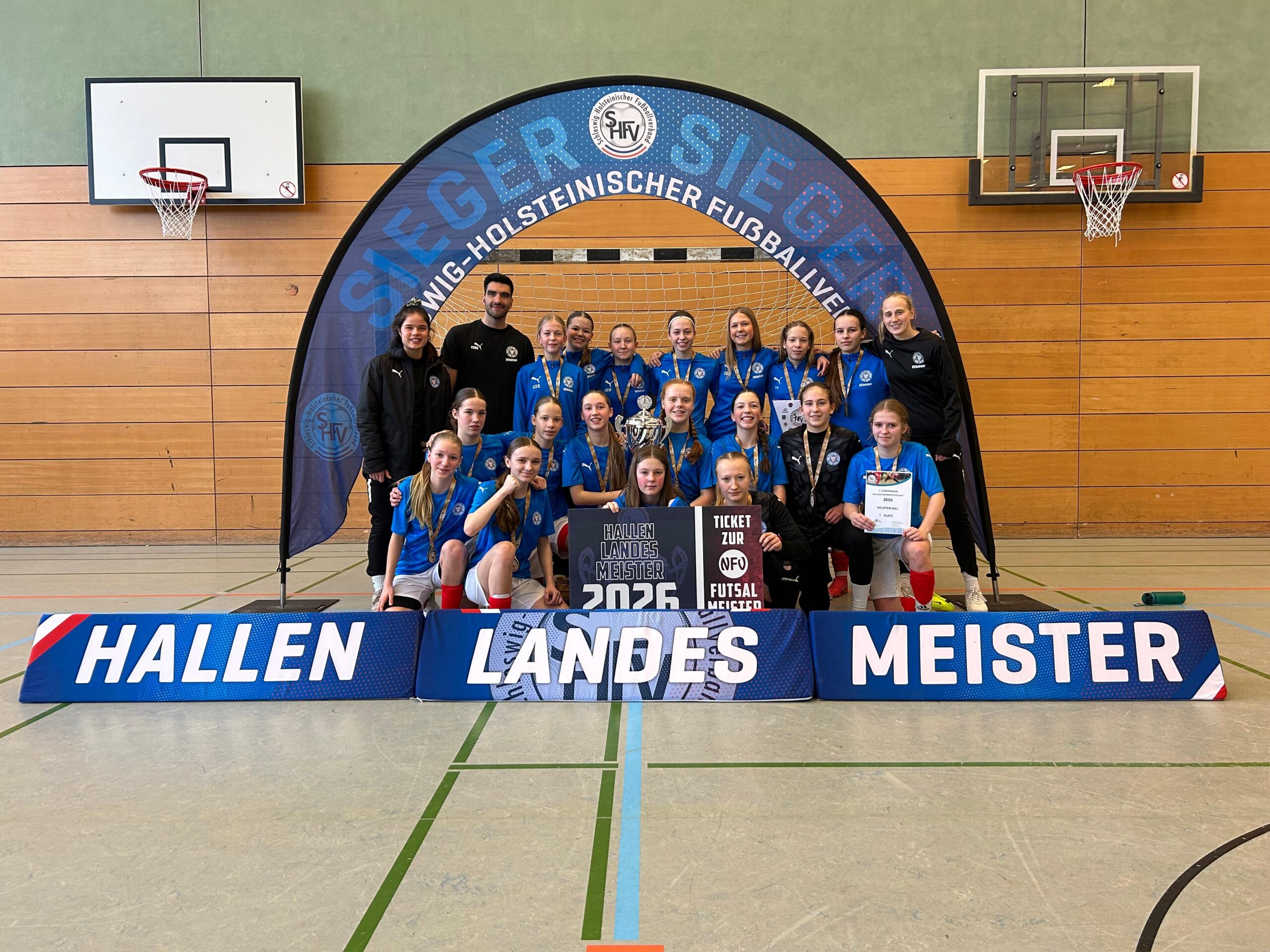 - Die C-Juniorinnen von Holstein Kiel sind die ersten SHFV-Hallenlandesmeister 2026! Die Kielerinnen patzten zwar im Auftaktspiel gegen den späteren Zweitplatzierten FSV Wyk-Föhr, gewannen dann aber jedes ihrer verbleibenden Spiele. Beide Teams qualifizierten sich zudem für die Norddeutschen Meisterschaften.