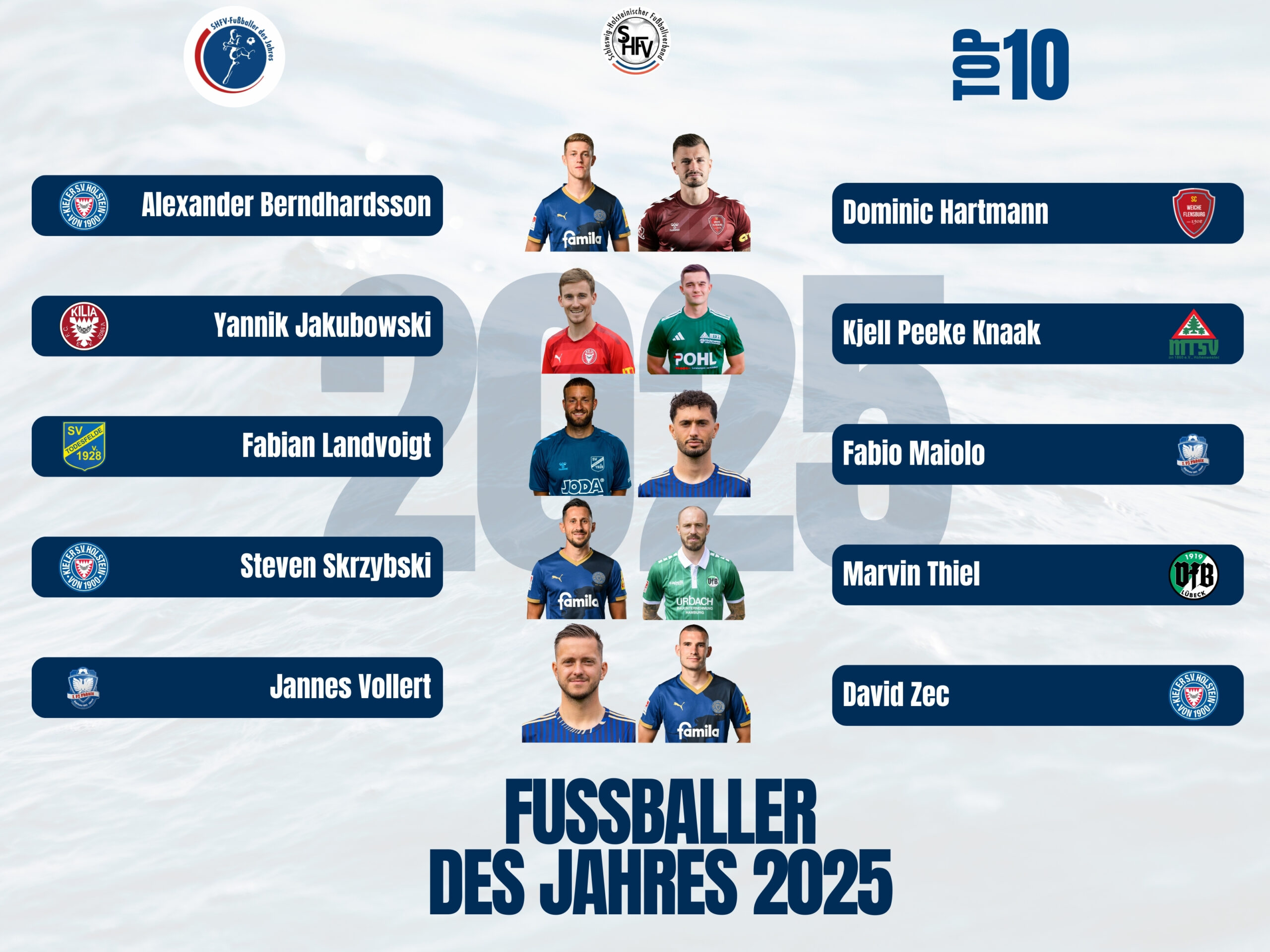 Im Vorfeld hat ein Gremium aus Sportjournalist*innen und SHFV-Funktionär*innen bereits abgestimmt und pro Kategorie jeweils zehn Kandidat*innen bestimmt. Nun liegt es an den Fans: Mit Ihrer Stimme entscheiden Sie mit, wer die Auszeichnungen als Fußballer, Fußballerin und Trainer des Jahres 2025 erhält.