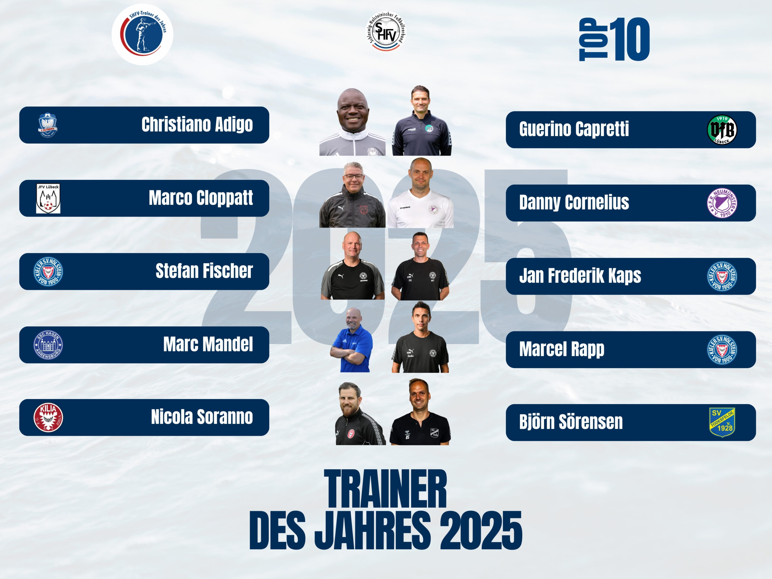 Wer prägte das Fußballjahr 2025 in Schleswig-Holstein besonders? Wer überzeugte als bester Spieler, beste Spielerin oder als herausragender Trainer? Gemeinsam mit LOTTO Schleswig-Holstein startet der Schleswig-Holsteinische Fußballverband erneut die traditionellen Wahlen und sucht die Top-Akteur*innen des vergangenen Jahres. Nach den Erfolgen von Finn Porath, Fenja Bannach und Marcel Rapp im Vorjahr stellt sich nun die Frage: Wer übernimmt diesmal die Spitzenpositionen?