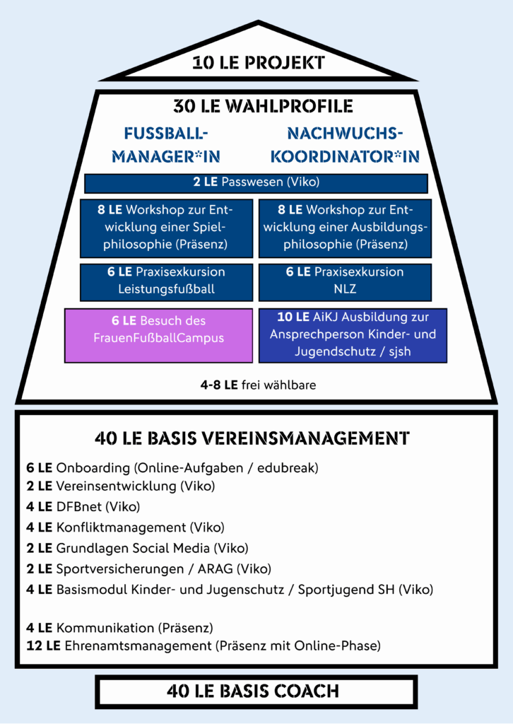Du liebst den Fußball und möchtest mehr bewegen als nur den Ball? Dann ist die fußballspezifische Vereinsmanager-C Lizenz des Schleswig-Holsteinischen Fußballverbands (SHFV) genau das Richtige für dich! Ab sofort sind neue außersportliche Lehrgangsangebote für Vereine und Vereinsverantwortliche abrufbar! Die Vereinsmanager C-Lizenz umfasst 120 Lerneinheiten (LE) und besteht aus zwei Pflichtmodulen sowie einem jeweiligen Wahlmodul (siehe Schaubild). Wir empfehlen, die aufgezeigte Reihenfolge der Module einzuhalten, eine Belegung einzelner Module ohne die Absicht eines Lizenzabschlusses ist aber ebenso möglich. Die einzelnen Termine für den Vereinsmanager-C werden bis Ende des Jahres nach und nach online freigeschaltet, daher schaut gerne regelmäßig in den Veranstaltungskalender.